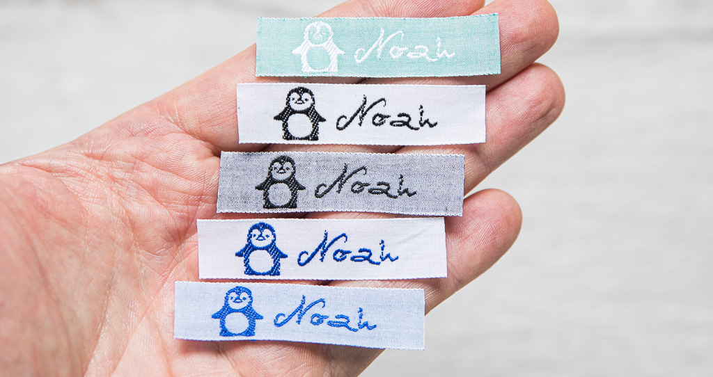 Étiquette tissée en coton avec motif pingouin, dans le nuancier « Classic Light », idéale pour vêtements enfants. Personnalise maintenant.