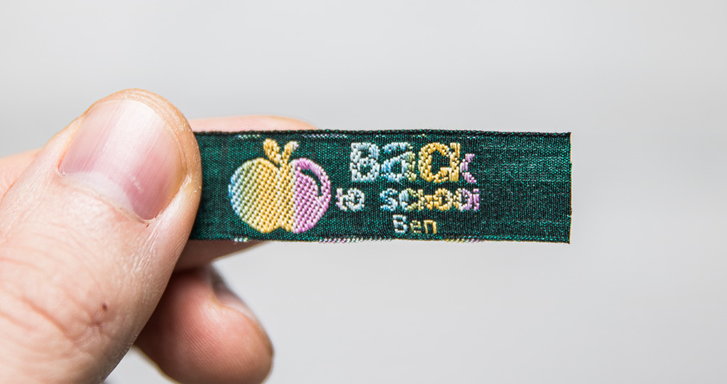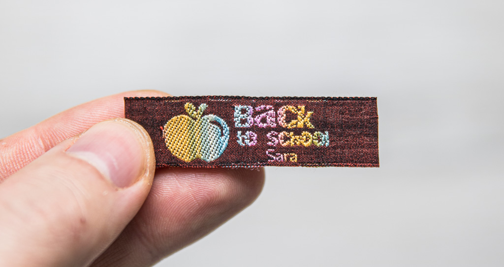 Étiquettes textiles avec impression multicolore, à armure toile.